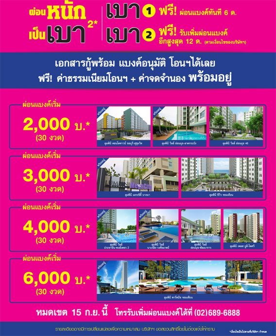 อบอุ่นใจหลังการขายด้วยการบริหารชุมชนภายใต้แนวคิด "ชุมชนน่าอยู่" ครบครันด้วยสิ่งอำนวยความสะดวกภายในโครงการ แบงค์อนุมัติพร้อมเข้าอยู่ ผ่อนแบงค์สบายเริ่มต้น 2,000 บาท* (30 งวด) ฟรี! ค่าธรรมเนียมการโอน + ค่าจดจำนอง หมดเขต 15 ก.ย. 57 นี้