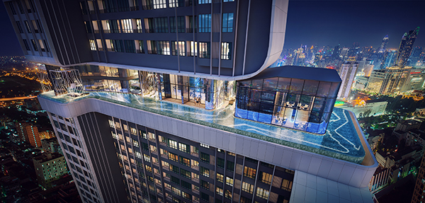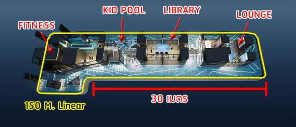 Highlight ส่วนกลางของที่นี่เลยค่ะ นอกจากสระว่ายน้ำจะลอยฟ้าสวยงามแล้ว ยังมาแนวโดดเด่น ด้วยการเป็นสระว่ายน้ำแบบว่ายชมวิวได้ทุกจุดแบบ 360 องศาด้วยค่ะ มองจากมุมบนจะเห็นส่วนกลางพร้อมสระว่ายน้ำแบบชมวิวได้ 360 องศา ขอบสระวัดแบบรอบตึกได้ประมาณ 150 เมตร
