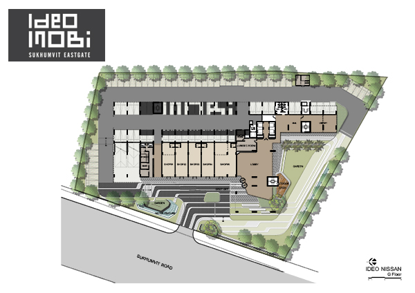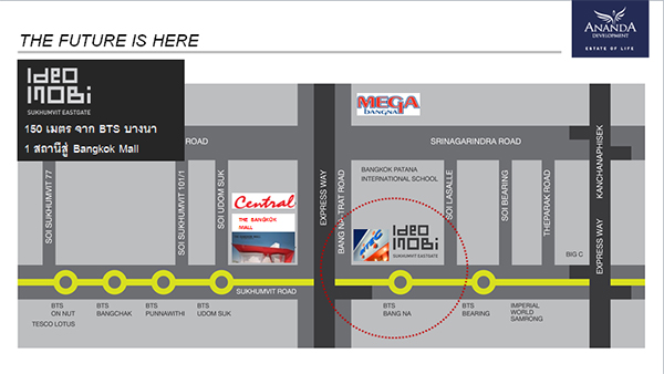 ภาพ Perspective โครงการสูง 30 ชั้น 849 ยูนิต ห่างจาก BTS สถานีบางนาเพียง 150 เมตร (ชมภาพทำเลเบื้องต้นได้ที่นี่) Master Plan โครงการค่ะ ติดถนนสุขุมวิท ภาพแสดงแผนที่ "Bangkok Mall" และ IDEO MOBI Sukhumvit Eastgate ซึ่ง Bangkok Mall จะ