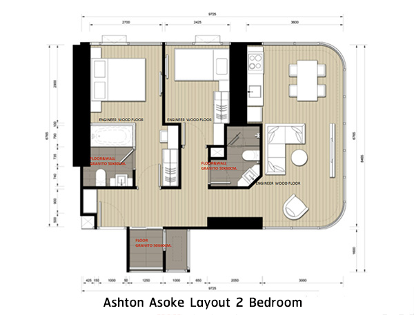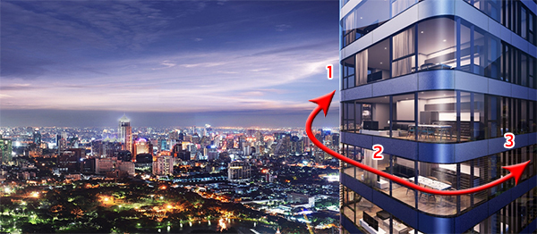 (ชมภาพทำเลโครงการเบื้องต้นได้ที่นี่) และเนื่องจากเป็นโครงการเกรด Luxury ของอนันดาฯ ดีไซน์ทั้งภายนอก และภายในของโครงการจึงดูโดดเด่นน่าสนใจมากๆ ภาพ Perspective จากมุมไกลจะเห็นว่าอยู่ใจกลางสี่แยกอโศกเลย ติด Terminal 21 และสยามสมาคมฯ Master Plan โครงการติดถนนอโศกมนตรี โถงต้อนรับด้านหน้าตกแต่งไว้อย่างโอ่อ่า สวยงาม โครงการสูง 50 ชั้น 1 อาคาร (แต่ดีไซน์ออกมาได้เหมือน 2 อาคาร) พร้อมตัวอาคารที่ดูผอมเพรียว เพราะรูปร่างแปลงที่ดินที่ออกจะเป็นแนวยาวมากกว่าเป็นสี่เหลี่ยมจัตุรัส จุดเด่นที่น่าสนใจของโครงการนี้ก็เช่น มีล็อบบี้โล่งในอาคารแบบเปิดโล่งลอยฟ้า (Sky Atrium Lobby) แบบภาพข้างบน ซึ่งเราทราบมาว่าจะมีพื้นที่เปิดโล่งแบบนี้ในทุกๆ ชั้นพักอาศัยกันเลยล่ะค่ะ ดีไซน์ที่แปลกใหม่สำหรับยูนิตบางยูนิตที่นี่คือยูนิตแบบ 2 ห้องนอน (ยูนิตสุดท้ายของแต่ละชั้น) ที่จะสามารถชมวิวได้ 3 ด้านเกือบ 270 องศากันเลยทีเดียว โดยยูนิตที่จะชมวิวแบบนี้ได้คือยูนิตแบบ XL ขนาด 64-64.5 ตร.ม. Layout ห้องของยูนิตแบบ XL (64-64.5 ตร.ม.) จะเห็นว่าเป็นกระจก 3 ด้านในส่วนของ Living Room