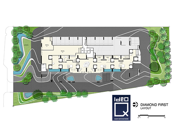 ภาพ Perspective จากมุมไกล ตัวโครงการตั้งอยู่ที่โรงแรม First Hotel เดิมบนถนนเพชรบุรีค่ะ (ชมภาพทำเลเบื้องต้นได้ที่นี่) แผนที่โครงการตั้งอยู่ใกล้สี่แยกราชเทวีค่ะ ซึ่งแยกนี้ยังมีแปลงที่ดินใหญ่ๆ ที่รอการพัฒนาอีก 2 แปลง ( คลิกเพื่อชมพิกัด Google Maps โครงการอดีโอ คิว สยาม - ราชเทวี ) Master Plan โครงการ โครงการนี้ (สูง 36 ชั้น) อยู่ใกล้กับโครงการพี่ที่เปิดตัวไปเมื่อปีที่แล้วคือ IDEO Q Ratchathewi (สูง 37 ชั้น) ซึ่งเราได้ทำภาพเปรียบเทียบเล่นๆ ให้ดูความสวยงามของโครงการคู่พี่-น้องนี้ว่าเมื่อเสร็จแล้ว จะยืนเคียงคู่กันสวยงามแค่ไหนค่ะ