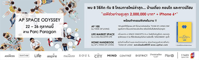 บริษัท เอพี (ไทยแลนด์) จํากัด (มหาชน) จัดงานใหญ่ส่งท้ายปี นําเสนอ 8 วิธีคิดการดีไซน์สเปซกับ 8 โครงการใหม่ล่าสุด พร้อมไฮไลท์พิเศษ "AP 100" สุดยอดโครงการบ้านเดี่ยว ทาวน์โฮม คอนโดมิเนียม 100 ยูนิตที่ดีที่สุดของเอพี รวมกว่า 60 โครงการพร้อมอยู่ทั่วเมือง ด้วยราคาเริ่มต้น 1.9 - 40 ล้านบาท และโปรโมชั่น - ข้อเสนอสุดพิเศษ "เอพีช่วยจ่ายสูงสุด 2,000,000 บาท จองและทําสัญญาในงานรับเพิ่ม iPhone 6"