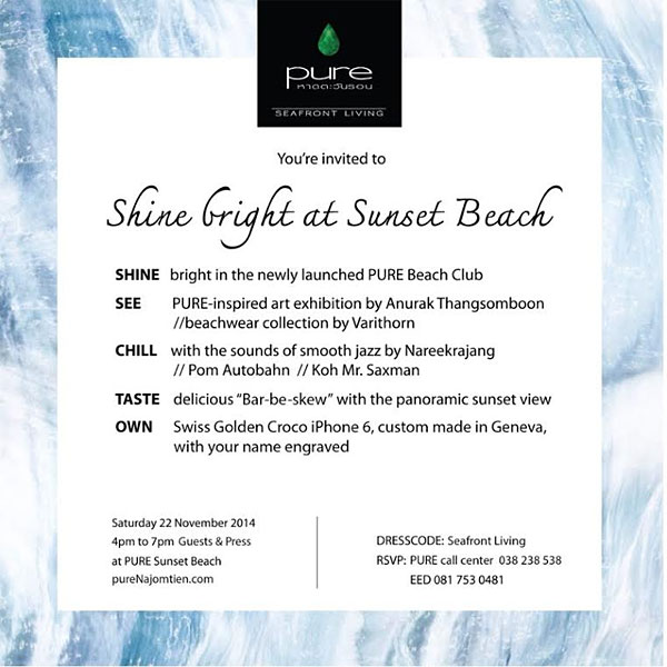 นอกจากนี้ในวันที่ 22 พ.ย. 57 นี้ บริษัท เวสเทิร์น ซีวิว จำกัด มีความประสงค์จะเรียนเชิญสื่อมวลชนเข้าร่วมเยี่ยมชมโครงการ PURE Sunset Beach ภายใต้ชื่องาน "Shine Bright at Sunset Beach" ณ ที่ตั้งโครงการ ติดหาดตะวันรอน จุดชมวิวพระอาทิตย์ตกที่สวยที่สุดด้วย