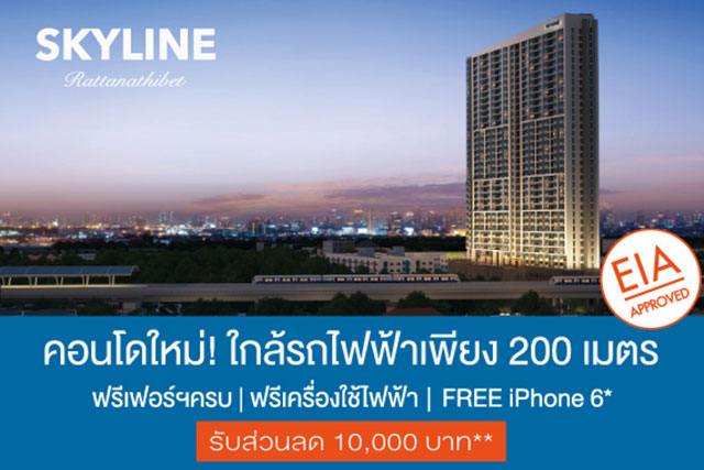 โครงการ สกายไลน์ รัตนาธิเบศร์ (Skyline Rattanathibet) ของเอเจ พร็อพเพอร์ตี้ ดีเวลลอปเมนท์ พร้อมเริ่มดำเนินการก่อสร้าง และฉลองผ่าน EIA APPROVED หลังจากเปิด Pre-Sale เมื่อวันที่ 27 กันยายน 2557 ที่ผ่านมาสกายไลน์ รัตนาธิเบศร์ (Skyline Rattanathibet) คอนโดใหม่ ติดถนนรัตนาธิเบศร์ ห่างจากรถไฟฟ้าสายสีม่วง เพียง 200 เมตร กับราคาเริ่มต้น 1.87 ล้านบาท เตรียมจัดงานที่เซ็นทรัล แจ้งวัฒนะ ชั้น G (ทางเข้าหลัก) ระหว่างวันที่ 24 - 30 พฤศจิกายน 2557 พิเศษ! จองในงาน รับฟรีบัตรกำนัลช้อปปิ้ง และเมื่อลงทะเบียนผ่านทางเว็บไซต์ รับส่วนลดเพิ่ม 10,000 บาท*สอบถามข้อมูลเพิ่มเติมได้ที่ โทร. 0-2526-1888 หรือทางเว็บไซต์ www.skyline-condominium.comข่าว-โปรโมชั่นล่าสุดอื่นๆ