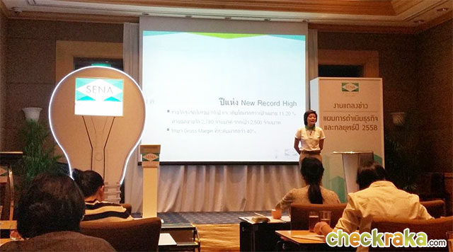 บมจ.เสนาดีเวลลอปเม้นท์ (SENA) เปิดแผนธุรกิจปี 58 เตรียมพร้อมลงทุนครั้งใหญ่ เปิดตัว 11 โครงการอสังหาฯ ทั้งแนวราบและคอนโดฯ "เกษรา ธัญลักษณ์ภาคย์" ชูกลยุทธ์ "ไฟนีออน" เล็งเจาะฐานลูกค้าระดับกลางบน - ขยายธุรกิจ โซลาร์รูฟ หวังผลักดันรายได้เติบโตอย่างยั่งยืน เตรียมออกหุ้นกู้เพื่อลดอัตราดอกเบี้ยจ่ายของบริษัทฯและบริหารจัดการหนี้สินให้อยู่ในสัดส่วนที่เหมาะสม แย้มไตรมาส 3/58 เตรียมปรับแบรนด์เพื่อเป็นหนึ่งในดวงใจของผู้บริโภค ตั้งเป้าหมายรายได้ประมาณ 3 พันล้านบาท เมื่อเทียบกับปีที่ผ่านมาที่คาดว่าจะมีรายได้ตามเป้าที่ตั้งไว้