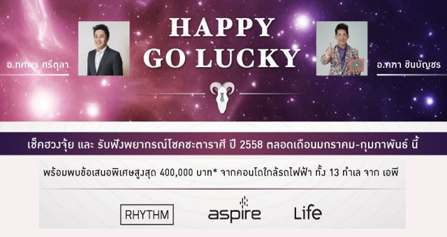 บริษัท เอพี (ไทยแลนด์) จำกัด (มหาชน) ผู้นำในการพัฒนาที่อยู่อาศัยสำหรับการใช้ชีวิตแบบคนเมือง จัดกิจกรรม "Happy Go Lucky" เช็คฮวงจุ้ย และรับฟังพยากรณ์โชคชะตาตลอดปี 2558 พบกับอาจารย์ทศพร ศรีตุลา หรือ อ.ช้าง โหรหนุ่มไฟแรง เจ้าของสโลแกน รู้ก่อน...แก้ไขได้ และอาจารย์คฑา ชินบัญชร ผู้ถูกขนานนามว่าเป็นหมอดูไพ่ยิปซี แห่งวงการโหราศาสตร์ พบกันได้ที่คอนโดมิเนียม 11 โครงการ กับ 3 แบรนด์คุณภาพ Rhythm, Aspire และ Life ตามวัน และเวลาดังนี้อาจารย์ทศพร ศรีตุลา