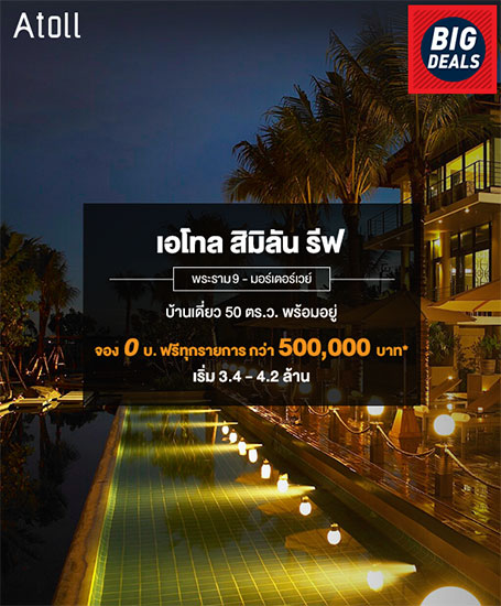 เอโทล สิมิลัน รีฟ บ้านอารมณ์ทะเลที่แสนสบายให้คุณสัมผัสความสุข ความงดงามในแบบที่ใกล้ชิดธรรมชาติอย่างแท้จริง กับบ้านสไตล์รีสอร์ท แฝงกลิ่นอายทะเลภายในโครงการ "สิมิลัน รีฟ" ยังมีหลากหลายสถานที่ ที่เอื้อความสะดวกสบายให้คุณยิ่งขึ้นอาทิ คลับเฮ้าส์ขนาดใหญ่ ในบรรยากาศอันดามัน ที่แบ่งสรรความสุขให้คุณเลือกได้ พร้อมสระว่ายน้ำ ศาลาริมสระ ห้องประชุม ห้องอเนกประสงค์ที่สามารถปรับเปลี่ยนเป็นฟิตเนสได้ พิเศษ! จอง 0 บาท ฟรีทุกรายการกว่า 500,000 บาท* เริ่ม 3.4 - 4.2 ล้าน