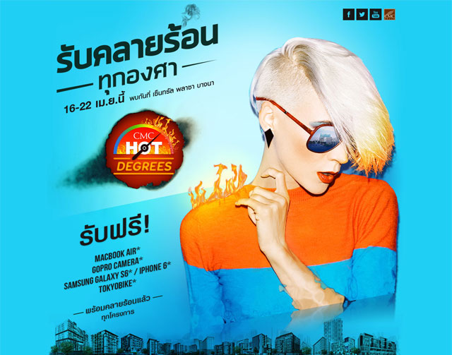 CMC Group เดินหน้าอัดแคมเปญรุกตลาดคอนโดมิเนียมอย่างต่อเนื่อง และเพื่อเป็นการตอบแทนความไว้วางใจที่ลูกค้าทุกท่านเลือกที่อยู่กับทาง CMC Group เสมอมา จึงส่งโปรโมชั่นเด็ดๆ ให้คุณได้คลายร้อนทุกองศาไปกับเราด้วยแคมเปญ "CMC HOT DEGREES รับคลายร้อนทุกองศา!!!" ที่คัดสรรคอนโดมิเนียมสุดหรูบนทำเลศักยภาพ พร้อมตอบโจทย์ทุกไลฟ์สไตล์ของการเดินทาง ใกล้สถานีรถไฟฟ้าพร้อมรองรับการใช้ชีวิตที่เป็นส่วนตัวเหนือระดับทุกย่างก้าวของการอยู่อาศัย และทั้งหมดนี้มาพร้อมกับโปรโมชั่นสุดพิเศษมากมายให้คุณได้เลือกเป็นเจ้าของคอนโดมิเนียมไลฟ์ไตล์เหนือระดับกับโปรโมชั่น "CMC HOT DEGREES รับคลายร้อนทุกองศา!!!" อาทิ รับฟรี Macbook Air, Gopro Camera, Samsung Galaxy S6, IPhone6, Tokyo Bike และทั้งหมดให้คุณได้สัมผัสการอยู่อาศัยที่เหนือระดับได้แล้ววันนี้