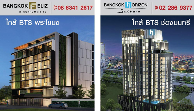 2. แบงค์คอก เฟ'ลิซ สุขุมวิท 69 (Bangkok Feliz Sukhumvit 69) ใกล้รถไฟฟ้า BTS สถานีพระโขนงเพียง 90 เมตร3. แบงค์คอก ฮอไรซอน สาทร (Bangkok Horizon Sathorn) ใกล้รถไฟฟ้า BTS สถานีช่องนนทรี