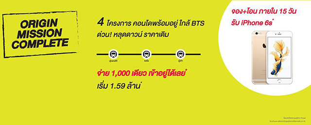 บริษัท ออริจิ้น พร็อพเพอร์ตี้ จำกัด (มหาชน) จัดโปรฯ "Origin Mission Complete" พบ 4 โครงการคอนโดพร้อมอยู่ หลุดดาวน์ ราคาเดิม ทำเลดีใกล้ BTS ปุณณวิถี, แบริ่ง และปู่เจ้าฯ จ่าย 1,000 เดียว เข้าอยู่ได้เลย* พิเศษ! จอง+โอน ภายใน 15 วัน รับ iPhone 6s*