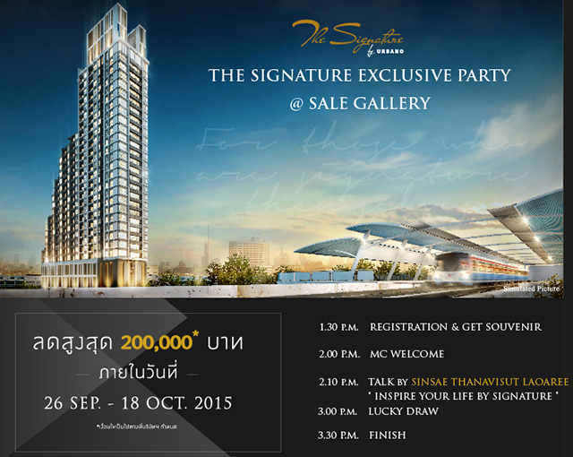 ในวันที่ 26 - 27 ก.ย. นี้ พบกับกิจกรรมพิเศษมากมาย และพลาดไม่ได้กับไฮไลท์ภายในงาน พบเซเลบริตี้ชื่อดังที่จะมาพูดถึงไลฟ์สไตล์ของคนเมืองภายใต้คอนเซปต์ "SIGNATURE COLLECTION FOR SIGNATURE ONE(s)" และซินแสชื่อดังในด้านลายเซ็น "INSPIRE YOUR LIFE BY SIGNATURE" สิทธิพิเศษสำหรับลูกค้าที่จองห้องชุดขนาด 3 ห้องนอน พื้นที่ 85 ตรม. รับส่วนลดทันที 200,000 บาท ทุกยูนิต ราคาเริ่มต้น 15 ล้านบาท