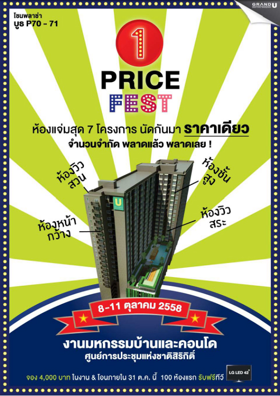 บริษัท แกรนด์ ยูนิตี้ ดิเวลล็อปเมนท์ จำกัด (แกรนด์ ยู) ปล่อยโปรโมชั่นกระตุ้นยอดขายช่วงไตรมาสสุดท้ายของปี ในงานมหกรรมบ้านและคอนโด ครั้งที่ 33 จัด "1 PRICE FEST" คอนโดมิเนียม 7 โครงการ 7 ทำเล คัดห้องชุดตำแหน่งเด่น หลากทิศ หลายวิว มาทำราคาเดียว เริ่มต้นเพียง 1.69 ล้านบาท พร้อมอัดโปรโมชั่น Top Up สำหรับผู้ที่ซื้อคอนโดพร้อมอยู่ของแกรนด์ ยู และเข้าอยู่ภายในเดือนตุลาคมนี้ รับโทรทัศน์ LG 42 นิ้ว 1 เครื่อง โดยเป็นเจ้าของได้ง่ายๆ จองเพียง 4,000 บาทเท่านั้น