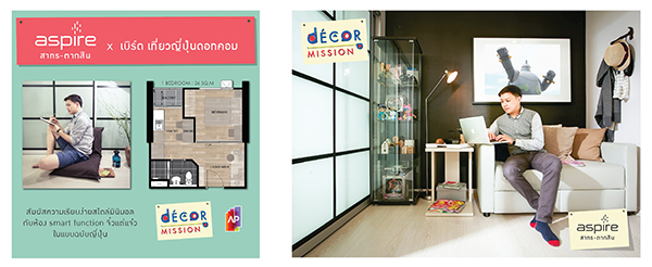 แอสปาย สาทร-ตากสิน ได้คุณเบิร์ด ปริญญา เจ้าของเว็บไซต์และแฟนเพจเที่ยวญี่ปุ่นดอทคอม ตัวแทนหนุ่มนักคิดนักเขียน ที่ชื่นชอบความเป็นญี่ปุ่น ห้องจึงถูกออกแบบในสไตล์ Minimalist เน้นความเป็น smart function จิ๋วแต่แจ๋วในแบบฉบับญี่ปุ่น แม้ต้องเดินทางบ่อยด้วยอาชีพประจำเป็นสจ๊วตสายการบิน แต่ก็อุ่นใจด้วยระบบรักษาความปลอดภัยของคอนโด