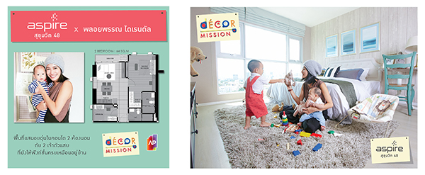 แอสปาย สุขุมวิท 48 ได้คุณพลอย พลอยพรรณ ไดเรนดัล ตัวแทนคุณแม่ยุคใหม่ที่ทำงานหนักแต่ก็ยังต้องการมีเวลาให้กับลูกๆได้อย่างเต็มที่ โดยได้ปรับฟังก์ชั่นคอนโด 2 ห้องนอนให้เป็นเหมือนบ้านเพื่อรองรับกิจกรรมของครอบครัว และดูแลลูกน้อยสองคนได้อย่างใกล้ชิด ถ่ายทอดความอบอุ่นของครอบครัวบนพื้นที่คอนโดพร้อมทั้งยังสามารถใช้เวลาส่วนตัวไปกับสิ่งอำนวยความสะดวกครบครัน