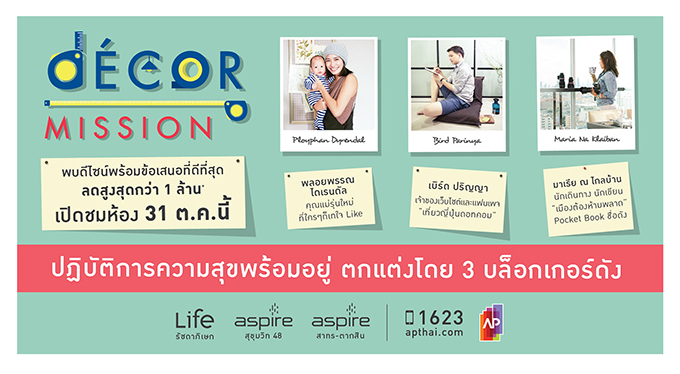 AP (Thailand) จัดโปรเจค De'cor Mission ปฏิบัติการความสุขพร้อมเข้าอยู่ กับ 3 บล็อกเกอร์ชื่อดังตัวแทนคนเมืองรุ่นใหม่ พลอย พลอยพรรณ ไดเรนดัล คุณแม่รุ่นใหม่ที่ใครๆ ก็เทใจไลค์ มาเรีย ณ ไกลบ้าน นักเดินทาง นักเขียน "เมืองต้องห้ามพลาด" พ็อคเก็ตบุ๊คชื่อดัง และ เบิร์ด ปริญญา เจ้าของเว็บไซต์และแฟนเพจเที่ยวญี่ปุ่นดอทคอม