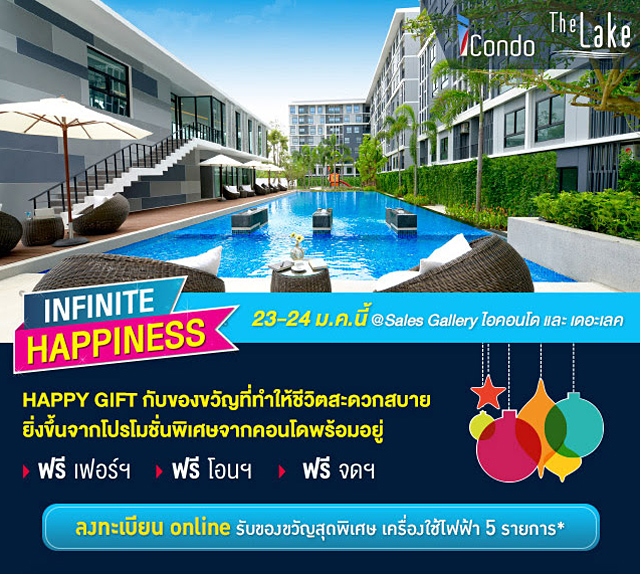 "Infinite Happiness" ในวันที่ 23-24 ม.ค. 59 @ Sales Gallery เพื่อมอบความสุขมากมายไม่รู้จบให้กับลูกค้า ในเดือนแห่งความสุขนี้ กับ HAPPY GIFT Promotion พบของขวัญสุดพิเศษจากคอนโดมิเนียมพร้อมอยู่ ทำเลใกล้รถไฟฟ้า ครบครันด้วยสิ่งอำนวยความสะดวก ทั้งสระว่ายน้ำ ฟิตเนส และพื้นที่สีเขียวส่วนกลาง ให้คุณใช้ชีวิตได้สะดวกสบายยิ่งขึ้น กับ 5 โครงการคุณภาพ