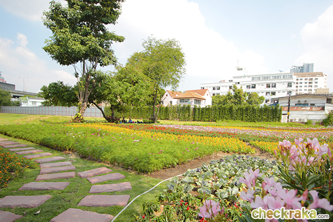 เนื้อที่ของโครงการตกแต่งด้วยดอกไม้สีสันสวยงาม ห้องตัวอย่าง "เมย์แฟร์ เพลส สุขุมวิท 50" (Mayfair Place Sukhumvit 50)