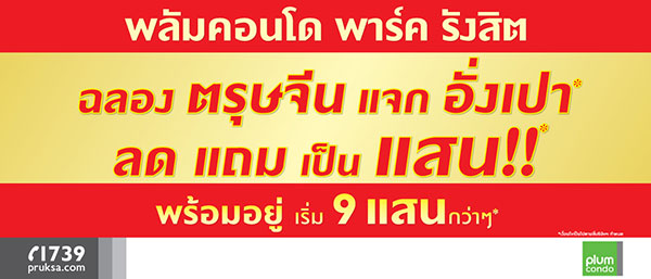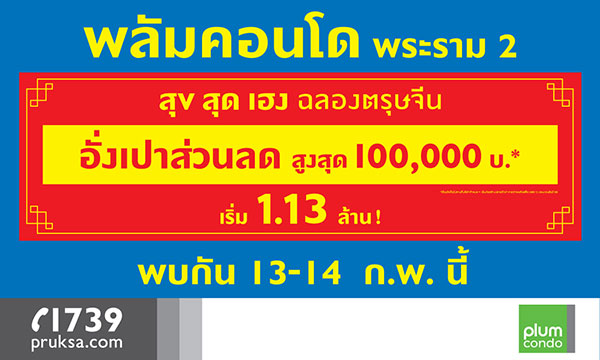 บริษัท พฤกษา เรียลเอสเตท จำกัด (มหาชน) จัดโปรโมชั่นแจกอั่งเปา ฉลองตรุษจีน ลดแถมเป็นแสน!!* กับคอนโด 3 โครงการ ได้แก่ พลัมคอนโด พาร์ค รังสิต, พลัม คอนโด เอ็กซ์ตร้า พระราม 2 และ คอนโดเลต พิกเซล สาทร