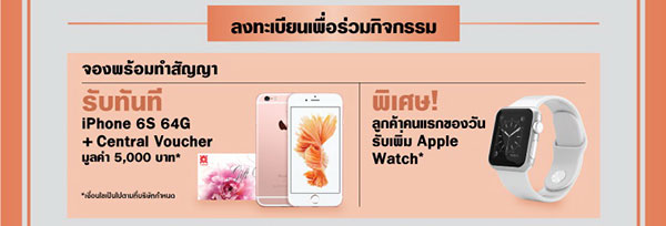 พิเศษ! สำหรับลูกค้าที่จองและทำสัญญาภายในวันงาน รับทันที! iPhone 6S 64G และ Central Voucher มูลค่า 5,000 บาท และสำหรับลูกค้าที่จองคนแรกของแต่ละวันรับเพิ่ม Apple Watch อีก 1 เรือน