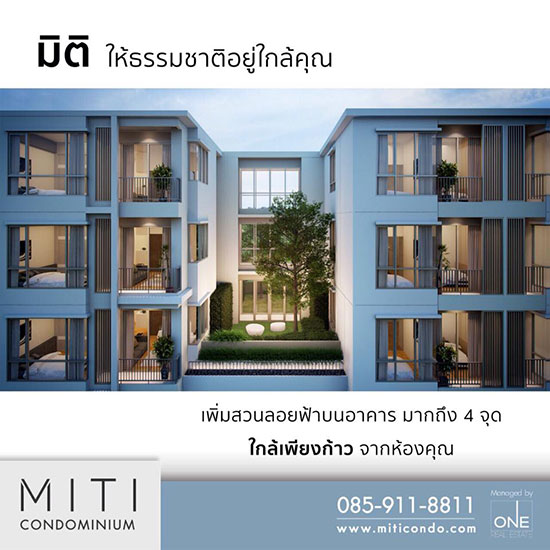บริษัท วันเรียลเอสเตท จำกัด เตรียมเปิดตัวคอนโดใหม่ "มิติ คอนโด (Miti Condo)" ที่มาพร้อมกับคอนเซปต์ มิติคอนโด ชีวิตที่แตกต่าง... อย่างลงตัว ตัวโครงการตั้งอยู่ติดกับถนนลาดพร้าววังหิน ซอย 72 เชื่อมต่อ 5 เส้นทางหลัก 3 เส้นทางรถไฟฟ้า