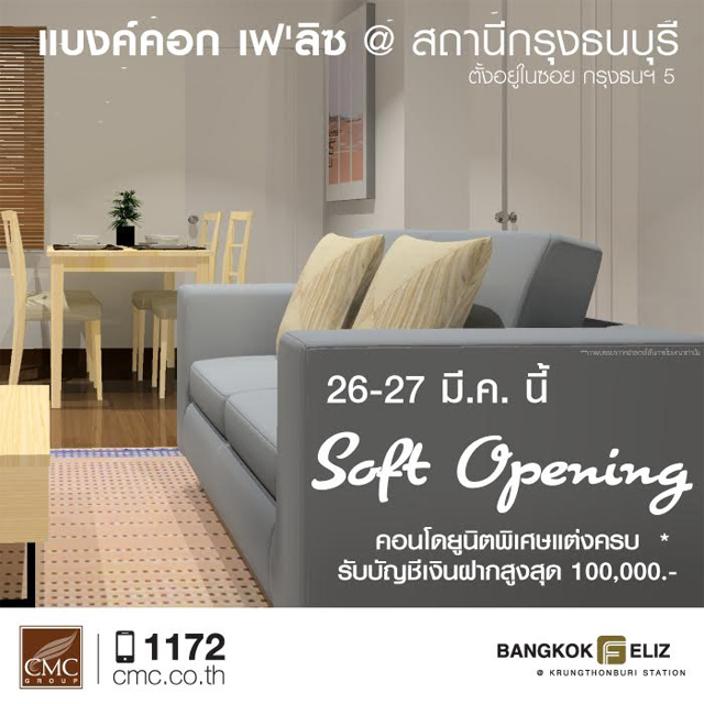 แบงค์คอก เฟ'ลิซ @ สถานีกรุงธนบุรี คอนโดยูนิตพิเศษตกแต่งครบ โดดเด่นด้วยดีไซน์ ที่เป็นส่วนตัว ฟังก์ชั่นที่ทันสมัย และตอบสนองความต้องการสิ่งใหม่ๆ ในชีวิตคุณ ตั้งบนทำเลศักยภาพที่ดีที่สุด พร้อมเชื่อมต่อย่านธุรกิจสำคัญต่างๆ จากสถานีรถไฟฟ้า BTS สถานีกรุงธุนบุรี เพียง 150 เมตรเท่านั้น วันที่ 26-27 มีนาคมนี้ พบโปรโมชั่นและข้อเสนอสุดพิเศษ "รับบัญชีเงินฝากสูงสุด 100,000 บาท" ในงาน Soft Opening @ Sales Gallery