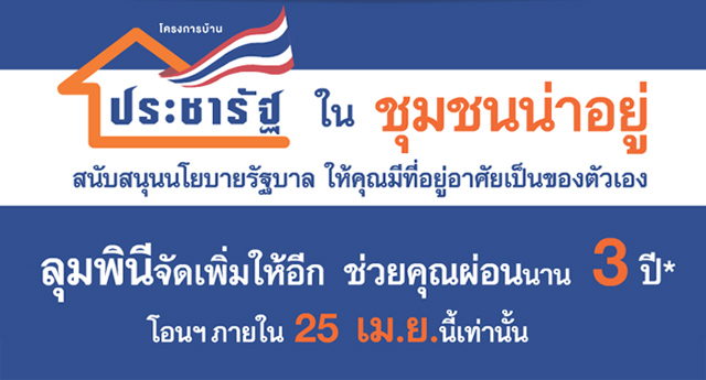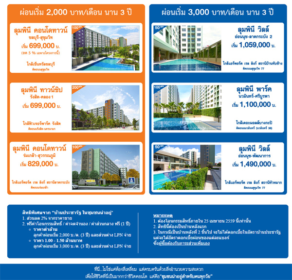 "บ้านประชารัฐ ในชุมชนน่าอยู่" จัดโปรโมชั่นดีที่สุดสำหรับคนอยากมีบ้าน!! ให้คุณมีบ้านหลังแรกเป็นของตัวเอง พร้อมโปรฯ สุดพิเศษ ลุมพินีจัดเพิ่มให้อีก ช่วยผ่อนแบงก์ นาน 3 ปี* เมื่อโอนภายใน 25 เม.ย.นี้ เท่านั้น