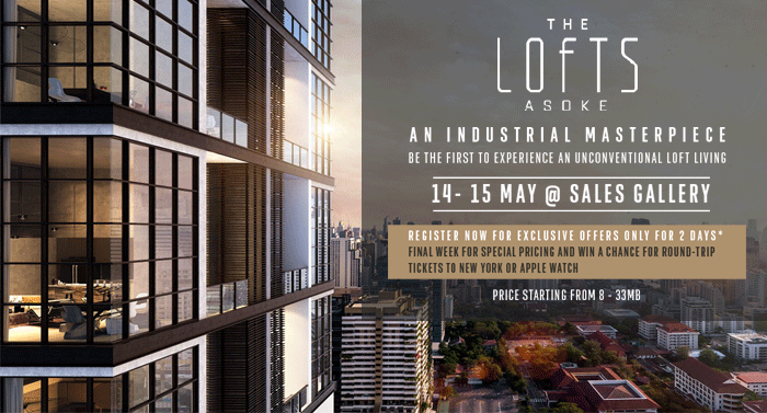 บริษัท ไรมอน แลนด์ จำกัด (มหาชน) เตรียมเปิดให้เข้าชมห้องตัวอย่างก่อนใคร กับ "เดอะ ลอฟท์ อโศก (The Lofts Asoke)" ในวันที่ 14 - 15 พฤษภาคมนี้ พร้อมรับข้อเสนอพิเศษ และลุ้นรับตั๋วเครื่องบินไปกลับ กรุงเทพฯ - นิวยอร์ก หรือ Apple Watch สำหรับ 2 วันนี้เท่านั้น