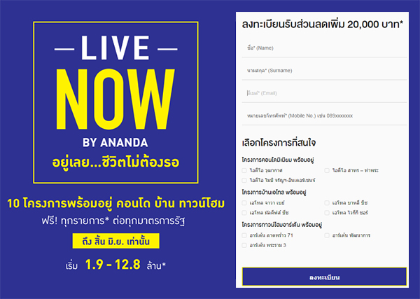เริ่มเข้าช่วงกลางปีแล้ว แต่ค่ายอสังหายักษ์ใหญ่ ผู้นำตลาดคอนโดมิเนียมติดรถไฟฟ้า กับค่ายอนันดา ดีเวลลอปเม้นท์ ยังแรงดีไม่มีตกจริงๆ ถึงจบแคมเปญ Big Deals และมาตรการรัฐ แต่อนันดาก็ยังอัดแคมเปญแรงต่อเนื่อง ล่าสุด ผู้บริหารหนุ่ม คุณชานนท์ เรืองกฤตยา ประธานเจ้าหน้าที่บริหาร และกรรมการผู้จัดการใหญ่ จัดแคมเปญสุดพิเศษ "LIVE NOW by Ananda อยู่เลย... ชีวิตไม่ต้องรอ" ที่งานนี้ขน 10 โครงการเด่นพร้อมอยู่ ทั้งคอนโด บ้าน และทาวน์โฮม กับข้อเสนอพิเศษสุด ฟรี! ทุกรายการ ต่อทุกมาตรการรัฐ พร้อมลุ้นรับส่วนลดและของแถมสูงสุดกว่า 800,000 บาท เริ่ม 1.9 - 12.8 ล้าน