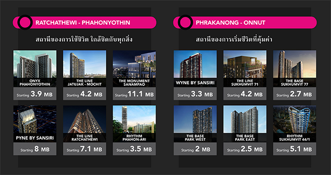 ทั้งนี้ คอนโดมิเนียมที่นำมาขายเป็นโครงการใหม่ที่อยู่ระหว่างสร้างและพร้อมโอนภายในปี 2559 และโครงการที่สร้างเสร็จแล้วนำมาขายต่อผลตอบแทนดี โดยมีทำเลพิเศษให้เลือกมากมาย ไม่ว่าจะเป็นย่านสุขุมวิท, ทองหล่อ, พหลโยธิน, อ่อนนุช อาทิเช่น เดอะ ไลน์ จตุจักร-หมอชิต (The Line Jatujak-Mochit) ใกล้รถไฟฟ้า BTS สถานีหมอชิต และ MRT สถานีสวนจตุจักร, ริธึ่ม พหลฯ-อารีย์ (Rhythm Phahol-Ari) ใกล้รถไฟฟ้า BTS สถานีอารีย์, เดอะ โมนูเมนต์ สนามเป้า (The Monument Sanampao) ใกล้รถไฟฟ้า BTS สถานีสนามเป้า, เดอะ เบส สุขุมวิท 77 (The Base Sukhumvit 77) ใกล้รถไฟฟ้า BTS สถานีอ่อนนุช ภายในงานยังมีโครงการคอนโดสร้างใหม่และพร้อมอยู่อีกมาย พบกันที่งาน "Next Station Your Condo" วันที่ 10-12 มิถุนายน 2559 นี้ ชั้น 1 สยามพารากอน