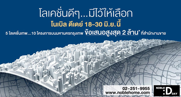 นายกิตติ ธนากิจอำนวย ประธานเจ้าหน้าที่บริหาร บริษัท โนเบิล ดีเวลลอปเมนท์ จำกัด (มหาชน) เปิดเผยว่า ปัจจุบันแม้ภาวะเศรษฐกิจไทยโดยเฉพาะภาคอสังหาฯ ในตอนนี้ดูไม่คึกคักมากนัก แต่คาดว่าในช่วงครึ่งปีหลังยังมีปัจจัยให้น่าลุ้นอยู่บ้าง ไม่ว่าจะเป็นเรื่องการทรงตัวของอัตราดอกเบี้ยที่ยังคงอยู่ในระดับต่ำ ก็คาดการณ์ว่าน่าจะสามารถทำให้ภาคอสังหาฯดีดตัวขึ้นมาได้ ดังนั้นบริษัท ฯ จึงได้จัดงาน "โนเบิล ดีเดย์" (NOBLE D:DAY) พร้อมส่งโปรฯสุดพิเศษเพื่อกระตุ้นยอดขายกลางปีรองรับความต้องการของกลุ่มครอบครัวใหม่และคนที่กำลังมองหาที่พักอาศัยเพื่อการใช้ชีวิตเมืองหรือเก็บไว้เป็นทรัพย์สินในระยะยาว โดยโครงการที่นำมาร่วมแคมเปญในครั้งนี้ คัดสรรโครงการพร้อมอยู่และโครงการติดสถานีรถไฟฟ้าที่ตั้งอยู่บนทำเลที่ดีที่สุดมานำเสนอให้กับผู้ที่ต้องการหาที่อยู่อาศัยบนทำเลศักยภาพเยี่ยมกับ 10 โครงการคุณภาพ ในราคาเริ่มต้นตั้งแต่ 3.8 ล้านบาท อาทิ