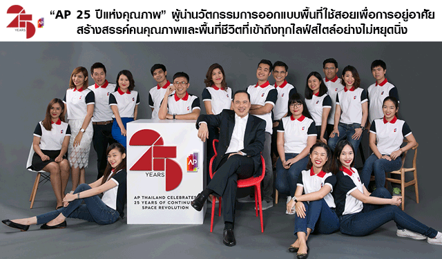 บริษัท เอพี (ไทยแลนด์) จำกัด (มหาชน) ผู้พัฒนาอสังริมทรัพย์ชั้นนำของประเทศไทย ก้าวเข้าสู่ปีที่ 25 กับพันธกิจสำคัญในการมุ่งพัฒนานวัตกรรมที่อยู่อาศัยสำหรับคนเมือง สร้างพื้นที่ชีวิตที่เข้าถึงทุกไลฟ์สไตล์ ผ่านวิธีคิดที่ลึกซึ้งในทุกขั้นตอนการออกแบบ อสังหาริมทรัพย์ ทั้งบ้านเดี่ยว คอนโดมิเนียม และทาวน์โฮม รวมกว่า 200 โครงการ มูลค่ากว่า 200,000 ล้านบาท ทั้งหมดเริ่มต้นจากความคิดต่างที่ไม่เคยหยุดนิ่ง ซึ่งจะเป็นพื้นฐานสำคัญในการผลักดันให้เอพีก้าวขึ้นสู่ Top 3 ในธุรกิจนี้