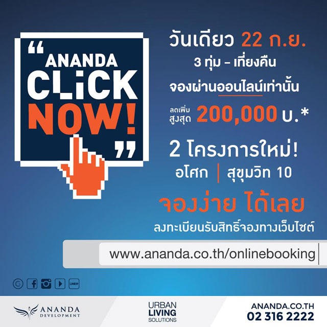 ร่วมสัมผัสประสบการณ์ครั้งแรกกับ "Ananda Click Now จองง่าย ได้เลย" จองผ่านออนไลน์เท่านั้น ลดเพิ่มสูงสุด 200,000 บาท คลิกลงทะเบียนรับสิทธิ์จองก่อนใคร วันนี้ - 22 ก.ย. และจองพร้อมกันวันเดียว 22 กันยายน 2559 เวลา 3 ทุ่ม - เที่ยงคืน (ราคาจองเพียง 30,000 - 100,000 บาทขึ้นอยู่กับขนาดห้อง)