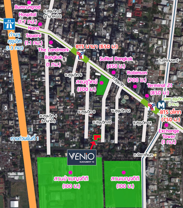 แผนที่โครงการ Venio Sukhumvit 10 แสดงระยะห่างจากสถานที่สำคัญรอบๆ โครงการGoogle Map พิกัด : 13.734887, 100.556966