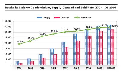 คุณพนม กาญจนเทียมเท่า กรรมการผู้จัดการ บริษัท ไนท์แฟรงค์ ประเทศไทย จำกัด ตัวแทนด้านการบริหารการขายและการตลาดของโครงการแต่เพียงผู้เดียว เผยว่า "ดีมานด์คอนโดมิเนียมบริเวณรัชดา-ลาดพร้าว ยังคงมีความต้องการที่สูง โครงการที่ขายอยู่ปัจจุบันมียอดขายรวมสูงถึง 86% โดยมียอดขายสะสมคิดเป็น 31,862 ยูนิตจากจำนวนทั้งหมด 36,803 ยูนิต โดยมีจำนวนยูนิตเหลือขายในตลาดเพียงแค่ 4,861 ยูนิต ย่านรัชดาภิเษกเป็นอีกทำเลหนึ่งในพื้นที่โดยรอบกรุงเทพชั้นใน (Fringe Area) ที่ได้รับความสนใจจากผู้ซื้อจำนวนมากทั้งคนไทยและต่างชาติ เช่น ชาวจีน สิงคโปร์ มาเลเซีย และฮ่องกง ที่ซื้อเพื่อเป็นที่พักอาศัยและซื้อเพื่อลงทุนเนื่องจากเล็งเห็นมูลค่าเพิ่ม เพราะเป็นย่าน New CBD ซึ่งเป็นพื้นที่ของอาคารสำนักงานเกรดเอหลายโครงการ รวมถึงอาคาร Super Tower ที่สูงถึง 125 ชั้น"
