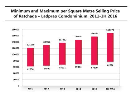 ระดับราคาขายคอนโดย่านรัชดา มีอัตราการเพิ่มเฉลี่ย 5% ต่อปี โดยเพิ่มจาก 98,000 บาทในปี 2011 เป็น 127,000 ในปีปัจจุบัน ทั้งนี้มีบางโครงการที่มีราคาสูงถึง 150,000 บาทต่อตรม.