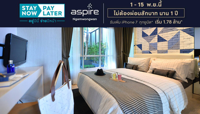 "ASPIRE งามวงศ์วาน" อยู่ปีนี้ จ่ายปีหน้า ไม่ต้องผ่อนสักบาท นาน 1 ปี* 1 - 15 พ.ย.นี้
