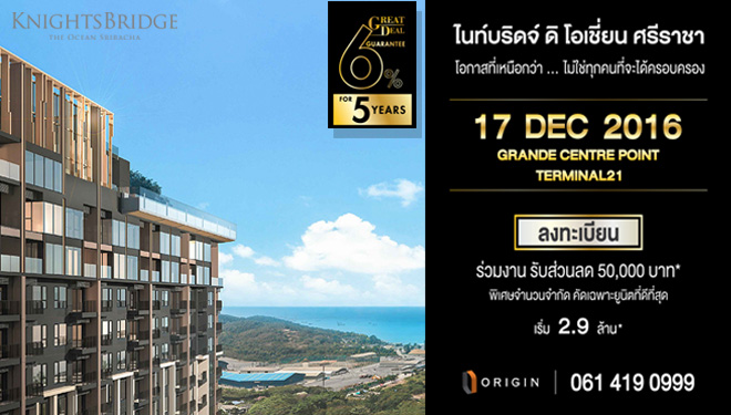 "ไนท์บริดจ์ ดิ โอเชี่ยน ศรีราชา (KnightsBridge The Ocean Sriracha)" ในวันที่ 17 ธ.ค. นี้ ที่ Grande Centre Point Terminal 21 เริ่ม 2.9 ล้านบาท พิเศษจำนวนจำกัด คัดเฉพาะยูนิตที่ดีที่สุด พิเศษ! สำหรับผู้ที่เข้าร่วมงาน รับส่วนลด 50,000 บาท*