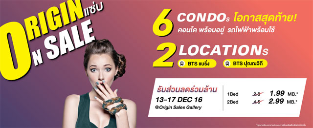 เตรียมพบกับมหกรรมลดกระหน่ำโอกาสสุดท้าย!! กับคอนโดคุณภาพเยี่ยม ติดสถานีรถไฟฟ้า 2 ทำเล สถานีแบริ่ง และ สถานีปุณณวิถี ล่าสุดบอสใหญ่ คุณพีระพงศ์ จรูญเอก ประธานเจ้าหน้าที่ บมจ. ออริจิ้น พร็อพเพอร์ตี้ เตรียมเอาใจลูกค้าในช่วงโค้งสุดท้ายของปี จัดมหกรรมลดกระหน่ำกับแคมเปญ "Origin แซ่บ On Sale" นำโครงการคอนโดฯ คุณภาพพร้อมอยู่ ติดสถานีรถไฟฟ้ากว่า 6 โครงการ จัดโปรโมชั่นพิเศษ อาทิ โครงการ บีรีพับบลิค สุขุมวิท 101/1, โครงการพอส สุขุมวิท 107, โครงการบีลอฟ สุขุมวิท 109 เป็นต้น ในราคาเริ่มต้นเพียง 1.59 ลบ. พิเศษสุดๆ !! รับส่วนลดร่วมล้านบาท สำหรับลูกค้าที่จอง+ทำสัญญาภายในงาน จ่ายในราคา 1 ห้องนอน แต่ได้ถึง 2 ห้องนอน (เงื่อนไขตามบริษัทฯ กำหนด) โดยงานจะจัดขึ้นในวันที่ 13-17 ธ.ค. นี้ ณ Origin Sales Gallery