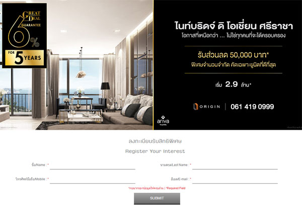 ไนท์บริดจ์ ดิ โอเชียน ศรีราชา โดยเตรียมจัดแคมเปญด้านการลงทุนอสังหาฯอย่างคุ้มค่า ภายใต้แคมเปญ "Great Deal Guarantee" ซื้อห้องชุดวันนี้พร้อมการันตียีลด์ 6% นาน 5 ปี (เงื่อนไขตามบริษัทฯกำหนด) พิเศษสำหรับลูกค้าที่ลงทะเบียนรับฟรี!! ส่วนลดสูงสุด 50,000 บาท โดยสามารถลงทะเบียนได้ที่ลิงก์ด้านล่างนี้