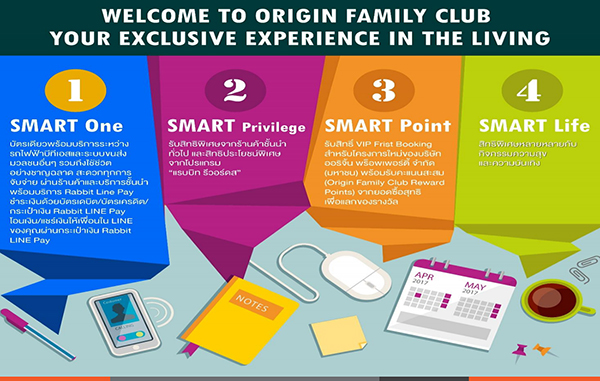 ล่าสุด บริษัทเริ่มตอบโจทย์ Digital Life Attitude ด้วยการจับมือกับบริษัท บางกอก สมาร์ทการ์ด ซิสเท็ม จำกัด (บีเอสเอส) ผู้ให้บริการบัตรแรบบิท จัดทำบัตร ORIGIN Family Club Card ใช้บัตรเพียงใบเดียวเข้าได้ทั้งคอนโดมิเนียมและรถไฟฟ้าบีทีเอส พร้อมได้รับทั้งแต้มของบริษัทและแต้มของแรบบิทสำหรับใช้รับสิทธิพิเศษต่างๆ มากมาย โดยจะทยอยส่งมอบบัตรดังกล่าวให้แก่ผู้อยู่อาศัยของบริษัทตั้งแต่ 1 ก.พ.นี้เป็นต้นไป