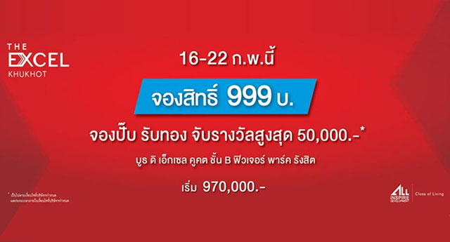 เตรียมเปิดจอง "ดิ เอ็กเซล คูคต" 16-22 ก.พ.นี้ จองสิทธิ์ 999 บาท พร้อมรับโชค 3 เด้ง