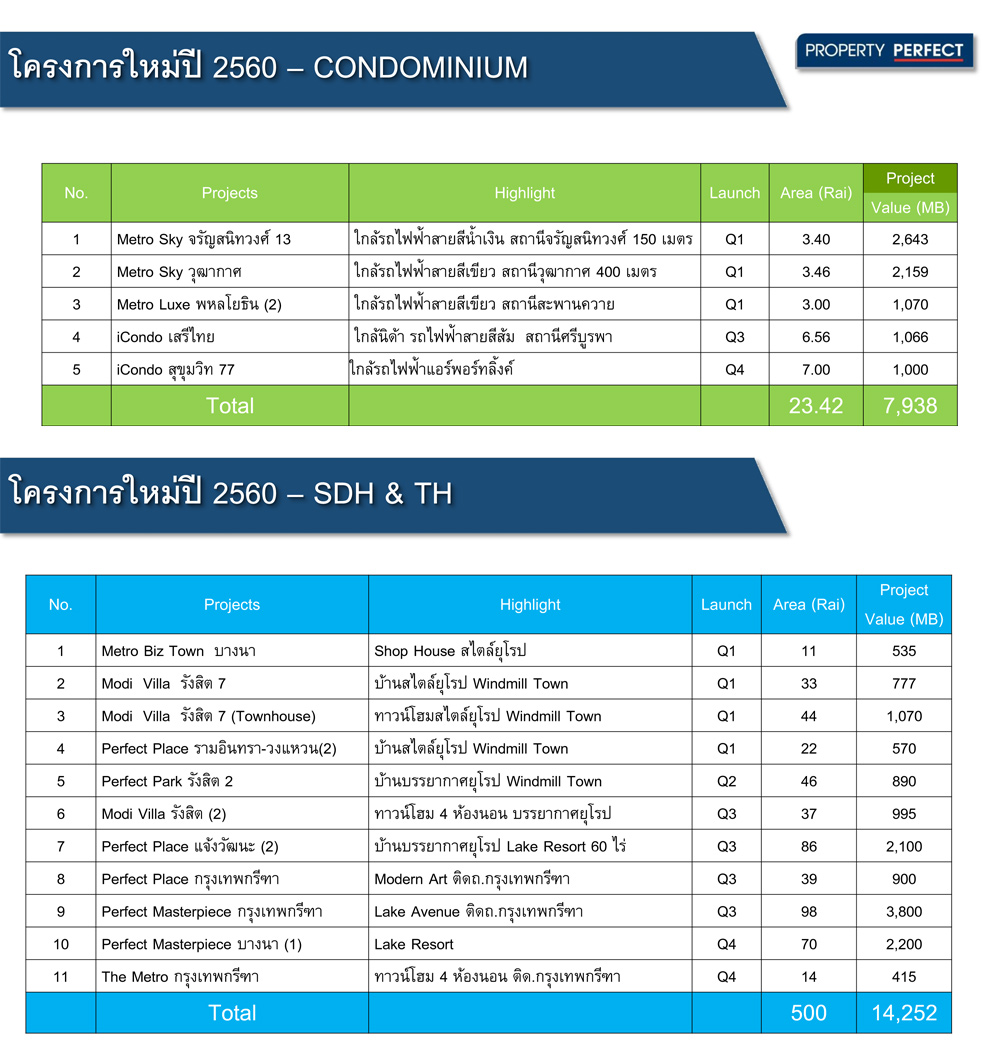 โครงการใหม่ 16 โครงการ มูลค่า 22,190 ล้านบาท แบ่งเป็นแนวราบ 11 โครงการ มูลค่า 14,252 ล้านบาท และคอนโดมิเนียม 5 โครงการ มูลค่า 7,938 ล้านบาท เปิดตัวในครึ่งปีแรก 8 โครงการ และครึ่งปีหลัง 8 โครงการ โดยจะเน้นกลุ่มลูกค้าที่มีรายได้ระดับกลางและสูง ตั้งเป้าสัดส่วนยอดขายจากบ้านเดี่ยวระดับบน 25% และจากบ้านเดี่ยวระดับกลาง 33% บริษัทยังจะนำแลนด์แบงค์ใหญ่ใน 2 ทำเล ได้แก่ แจ้งวัฒนะและกรุงเทพกรีฑา มาพัฒนาโครงการ โดยครึ่งปีแรก จะพัฒนาโครงการในทำเลแจ้งวัฒนะ พื้นที่รวม 400 ไร่ มูลค่า 10,000 ล้านบาท