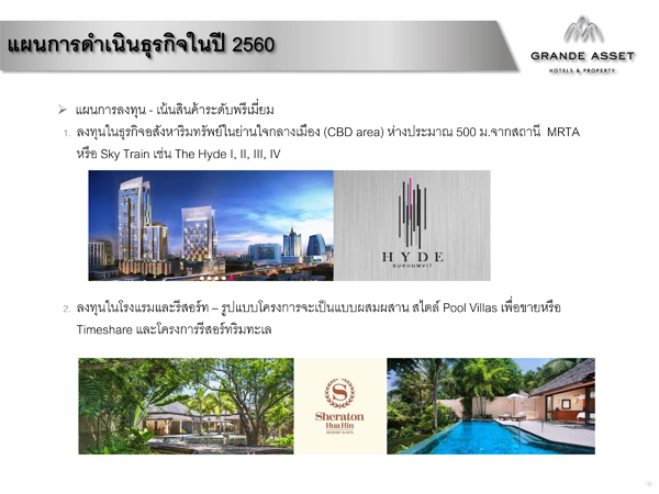 ส่วน GRAND เปิดเผยว่า ปีนี้มีแผนเพิ่มรายได้ด้วยคอนโดระดับพรีเมียมในเขตซีบีดี และวิลล่าเจาะกลุ่มลูกค้าไฮเอนด์ ปีนี้ GRAND จะมียอดโอนจากโครงการ เดอะไฮด์ สุขุมวิท 11 ในไตรมาส 4 จาก backlog จำนวน 2,100 ล้านบาท มีแผนจัดตั้งกอง REIT โรงแรมเชอราตันหัวหิน ซึ่งอยู่ระหว่างดำเนินการขออนุมัติกับหน่วยงานที่เกี่ยวข้อง และยังจะเปิดดำเนินการโรงแรมไฮแอท รีเจนซี่ กรุงเทพฯ ในปลายปีด้วย ทั้งนี้ วางงบลงทุนในระยะเวลา 2 ปี ไว้ประมาณ 2,000 ล้านบาท มีแผนออกหุ้นกู้ระยะยาวอายุไม่เกิน 5 ปี เพื่อสนับสนุนแผนการลงทุน และจะทยอยจัดตั้งกอง REIT โรงแรมที่เปิดดำเนินการแล้วเมื่อมีความพร้อม สำหรับการเปิดโครงการใหม่ GRAND มีแผนลงทุนโครงการแบบมิกซ์ยูส เป็นรีสอร์ทผสมผสานกับคอนโดมิเนียมและพูลวิลล่า บริเวณหาดแม่พิมพ์ จังหวัดระยอง พื้นที่ 90 ไร่ มูลค่าโครงการ 4,700 ล้านบาท