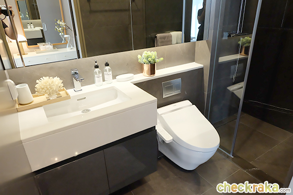 ห้องน้ำตกแต่งด้วยโทนสีดำ ทำให้ดูคลาสสิก ทันสมัย พร้อมสุขภัณฑ์ระบบอัตโนมัติ