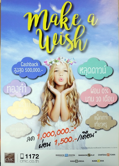 ในส่วนของ CMC มาในแคมเปญ Make a wish คิดอะไรก็ได้หมด โปรโมชั่นส่วนลดสูงสุด 1,000,000 บาท* ผ่อน 1,500 บาท/เดือน* และโปรโมชั่นอื่นๆ อีก อาทิ ทองคำ*,แพคเกจเที่ยวหรู*,ผ่อน 0% นาน 10 เดือน*,ฟรีเฟอร์นิเจอร์ แต่งครบ*, รับคะแนนสะสมฟรี 10 เท่า*