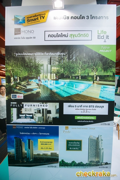 เสนาฯ มาด้วยกันทั้งหมด 16 โครงการ กับแคมเปญ "ลด จัดแจก" นำคอนโดฯ The Niche และ The Kith และบ้านพร้อมอยู่เข้าร่วมงาน พร้อมจัดหนักด้วยโปรโมชั่นแรงๆ จองภายในงานรับส่วนลดและของแถม รวมมูลค่าเกือบ 1 ล้านบาท