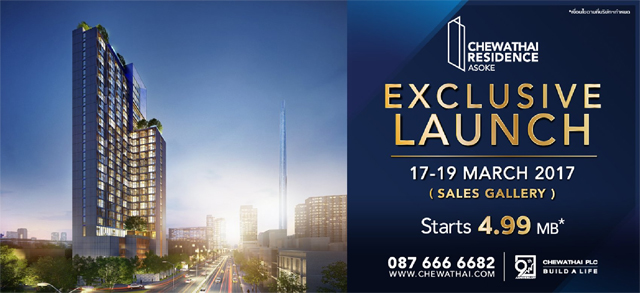 ชีวาทัย เรสซิเดนซ์ อโศก (Chewathai Residence Asoke) วันที่ 17-19 มีนาคม 2560 นี้ ที่ Sales Gallery เซอร์ไพรส์กับราคาเริ่มต้นเพียง 4.99 ล้านบาท*