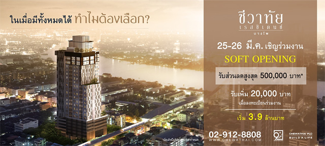 23 มี.ค. 60 1,414Soft Opening คอนโด "ชีวาทัย เรสซิเดนซ์ บางโพ" 25-26 มีนาคม นี้ ราคาเริ่มต้น 3.9 ล้านบาท
