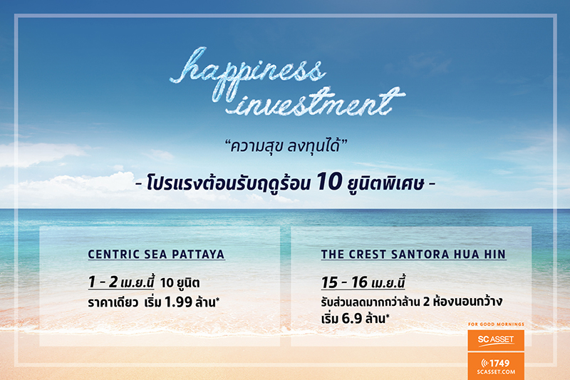 บริษัท เอสซี แอสเสท คอร์ปอเรชั่น จำกัด (มหาชน) จัดแคมเปญรับซัมเมอร์ "Happiness Investment พร้อมอยู่ พร้อมลงทุน" กับ 2 โครงการคอนโดมิเนียมตากอากาศ ทำเลใจกลางเมือง ใกล้ทะเล ได้แก่ โครงการ Centric Sea Pattaya คอนโดมิเนียมใจกลางพัทยา วันที่ 1-2 เมษายนนี้ และโครงการ The Crest Santora Hua Hin อีกหนึ่งคอนโดและวิลล่าติดทะเล ใจกลางเมืองหัวหิน พิเศษเฉพาะ 15-16 เม.ย. นี้