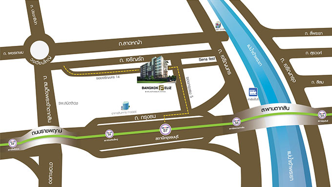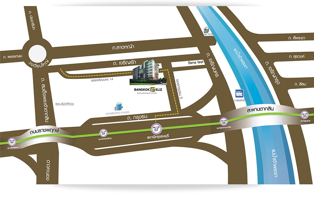 Facilities ภายในโครงการ หากกล่าวถึง ถนนกรุงธนบุรี จัดเป็นถนนสายที่มีศักยภาพสูง มีการขยายความเจริญที่หนาแน่นฝั่งสาทร, สีลม, พระราม 4, ข้ามผ่านสะพานสมเด็จพระเจ้าตากสิน มายังเส้นทางถนนกรุงธนบุรี ไปทางเพชรเกษม, กัลปพฤกษ์, ราชพฤกษ์ ทั้งนี้สาเหตุ มาจากที่ดินที่หายากขึ้น ในขณะที่ราคาของที่ดินและราคาของคอนโดต่อยูนิตสูงขึ้น จนไม่สามารถจับต้องได้ เมื่อรถไฟฟ้าสายสีเขียว เชื่อมต่อ MRT สายสีน้ำเงินแล้วเสร็จในปี 2562 และยังมีรถไฟฟ้าสายสีทองที่จะทำให้การเดินทาง การจราจร ระบบสาธารณะ เป็นไปอย่างราบรื่น ซึ่งคาดว่าราคาจะสูงขึ้นไปตามลำดับ